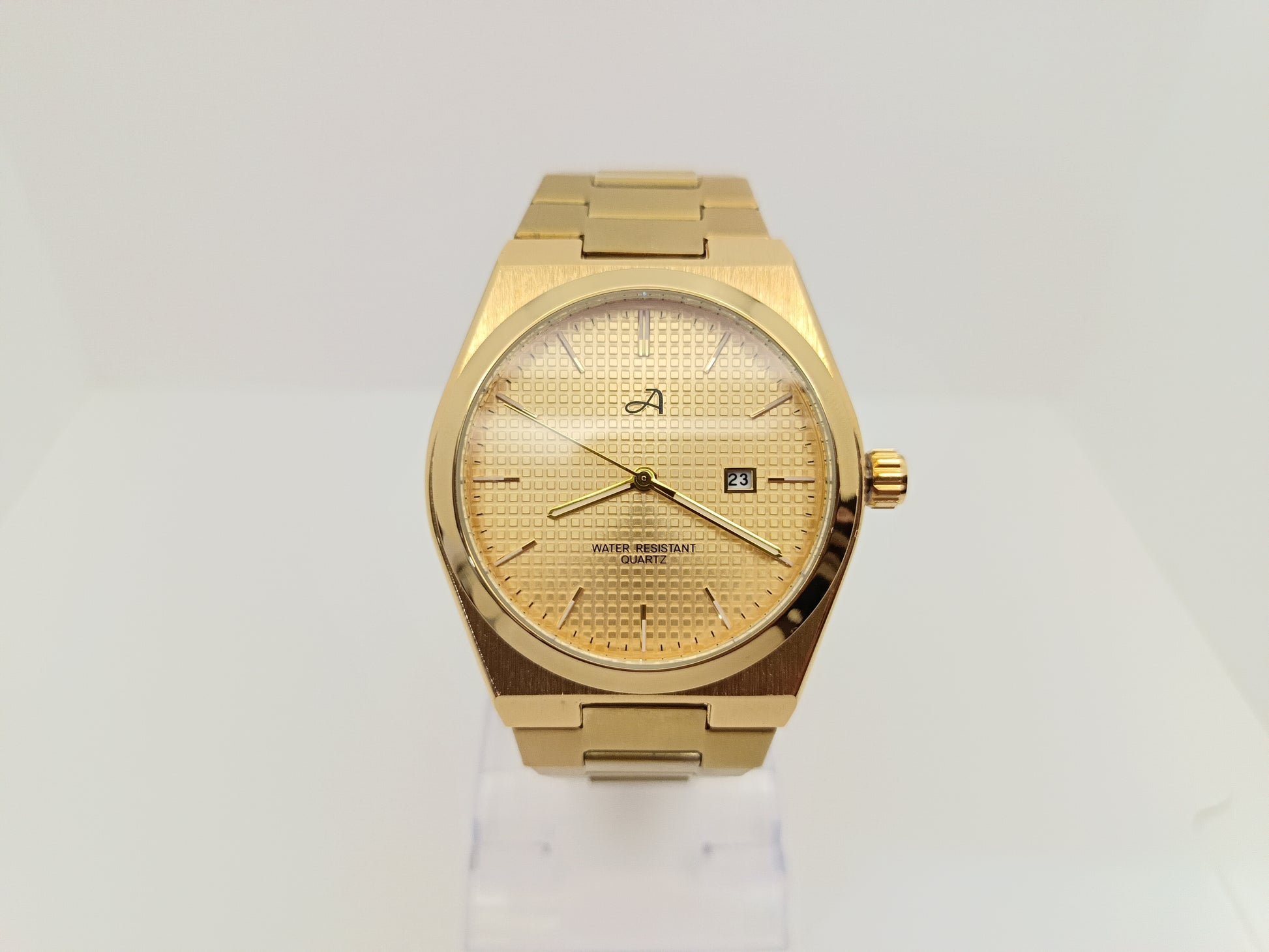 Relógio de Quartz em aço inoxidável com garantia de 1 ano (possibilidade de garantia extendida de 2 anos). Resistente à água. Hipoalergênico.
